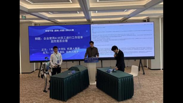 一边是机器人,一边是人类,在北京亦庄的机器人大世界,两名辩手正在围绕 “企业使用 AI 对员工... -