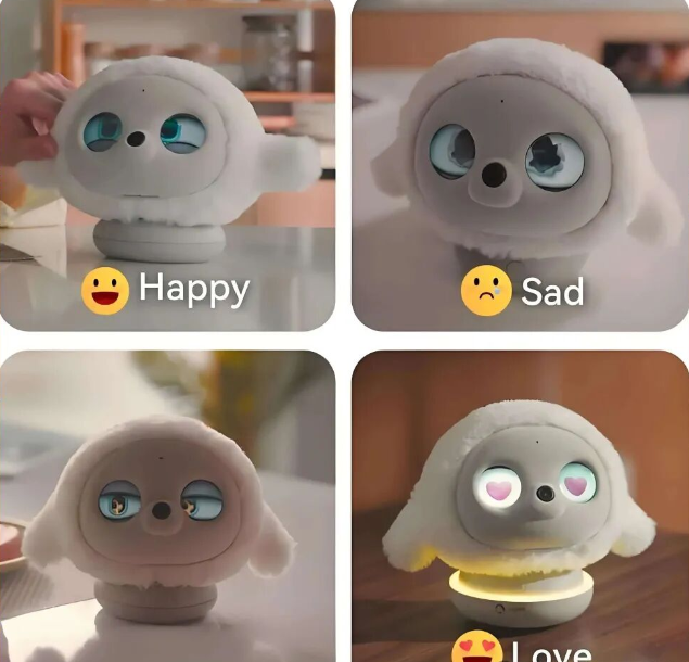 它的视觉与听觉传感器巧妙集成在鼻子部位,日常使用中几乎毫无存在感,不会让人“一眼出戏”。而那双能传递情绪的大眼睛,实际上是两块显示屏,可以清晰表达Ropet的喜怒哀乐。