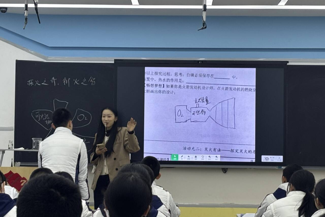 本次展示课由七中育才新进化学教师付了执教,课题为《探火之奇,御火之智——燃烧与灭火》。课程以“火箭升空”为真实情境,巧妙贯穿始终。课堂伊始,付老师借助“育才熊”云端和学生们一起学习第七单元知识框架引入课题,引导学生思考:“火箭升空时,为什么发动机中的燃料可以燃烧?”由此点燃学生的探究热情。付老师通过演示教材中经典的红磷与白磷燃烧对比实验,引导学生自主构建燃烧条件。学生随后化身“火箭设计师”,以小组为单位设计火箭燃烧室结构,将理论知识应用于模拟实践。